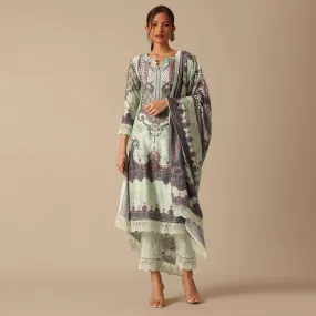 Khaddar Printed Shirt With High Neck Collar, Detailed With Loop Buttons On Sleeves. Paired With Printed Chiffon Dupatta & Ijaar Pants.